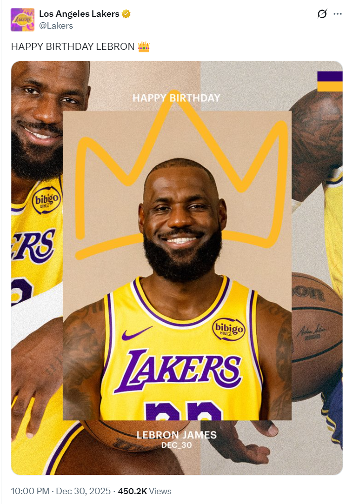湖人队官方也祝贺了勒布朗41岁生日快乐。