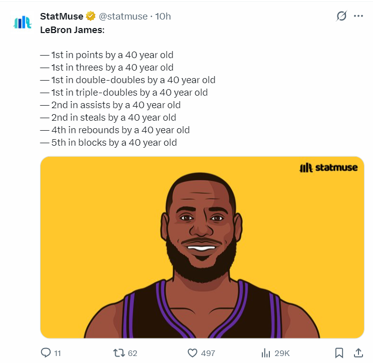 数据StatMuse媒体写道:40岁后得分第一,40岁后三分球第一、40岁后两双第一、40岁后三双第一、40岁后助攻第二、40岁后抢断第二、40岁后篮板第四、40岁后盖帽第五。