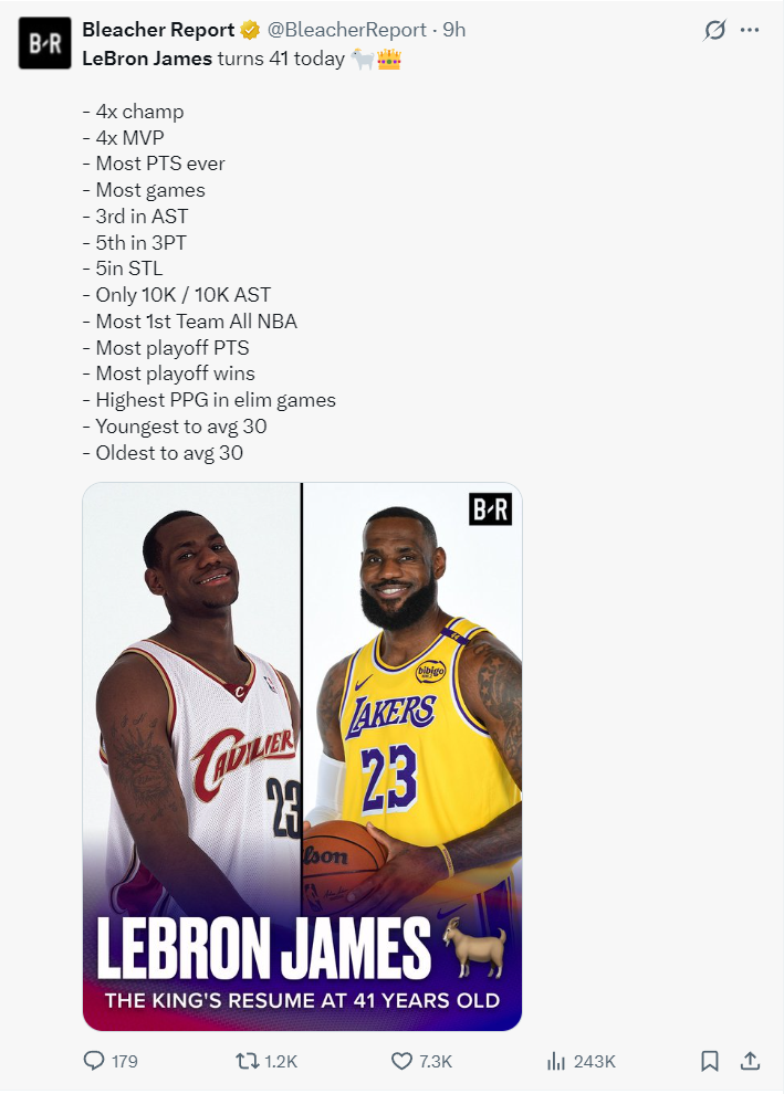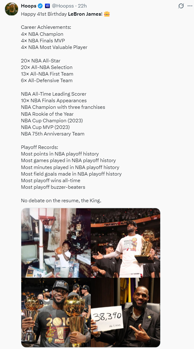 BR写道:4次总冠军、4次常规赛MVP、历史得分王、参赛场次最多、助攻榜第三、三分球第五、盖帽数第五、唯一1万助攻+1万抢断、最多一阵、季后赛得分最多、季后赛最多胜场、淘汰赛中得分最高、最年轻场均30+、最年长场均30+,他就是GOAT。